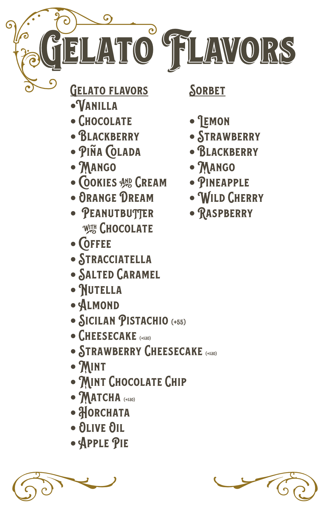 Gelato, an Italian frozen dessert that everyone can enjoy! Made with the highest quality ingredients, get gelato made fresh for your event. At 1914 Bakery, we have made gelato for four generations using a family recipe that has been passed down over the years, now offered as a catered service for weddings, birthdays, graduations, corporate events, and more. Have one of our staff come out with a vintage-themed cart and serve premium fresh gelato to your guests. Offering over 20 flavors to choose from, there is a flavor for everyone!